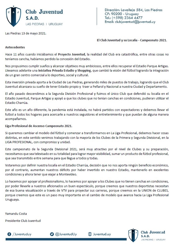 13.05.2021 Club Atlético Juventud emitió una carta respecto a su localía para esta temporada